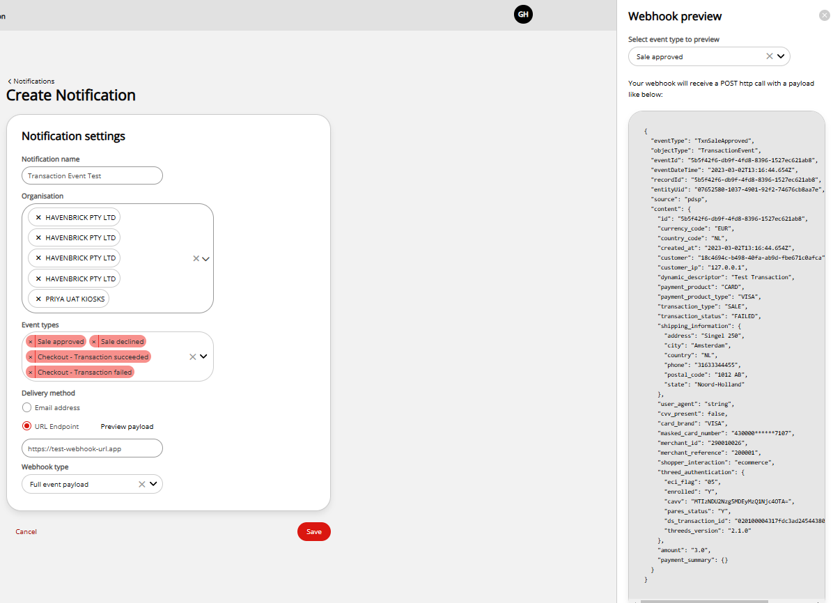 Webhook: Select URL endpoint to provide the URL of the webhook where the notification will be sent. Selecting the URL endpoint option will display additional options to send Event metadata only or Full event payload (ony available for transaction events). You can preview the webhook payload by clicking Preview payload.