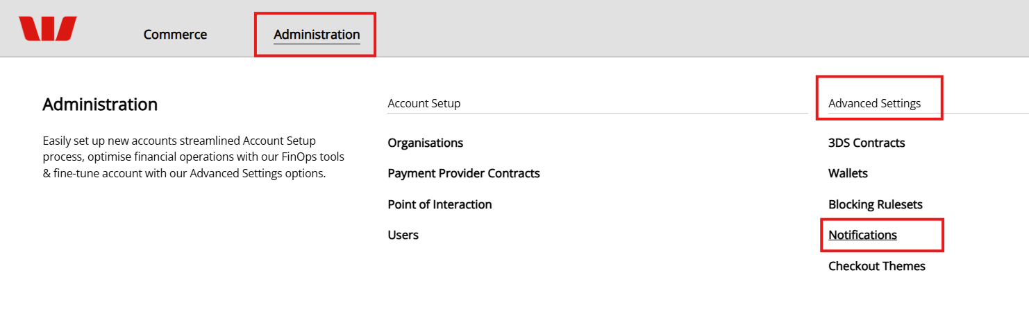 To access the Notifications section of the dashboard, navigate to Administration > Advanced Settings > Notifications.