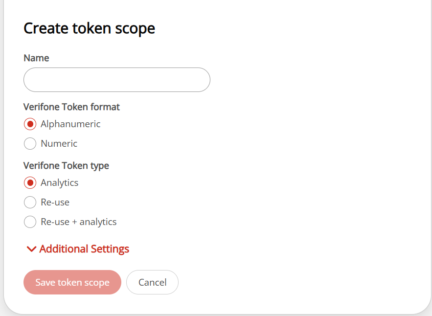 - Verifone Token format: Select your preferred token format. This selection only affects reuse tokens, as the analytics token has a fixed format, 29-digits: