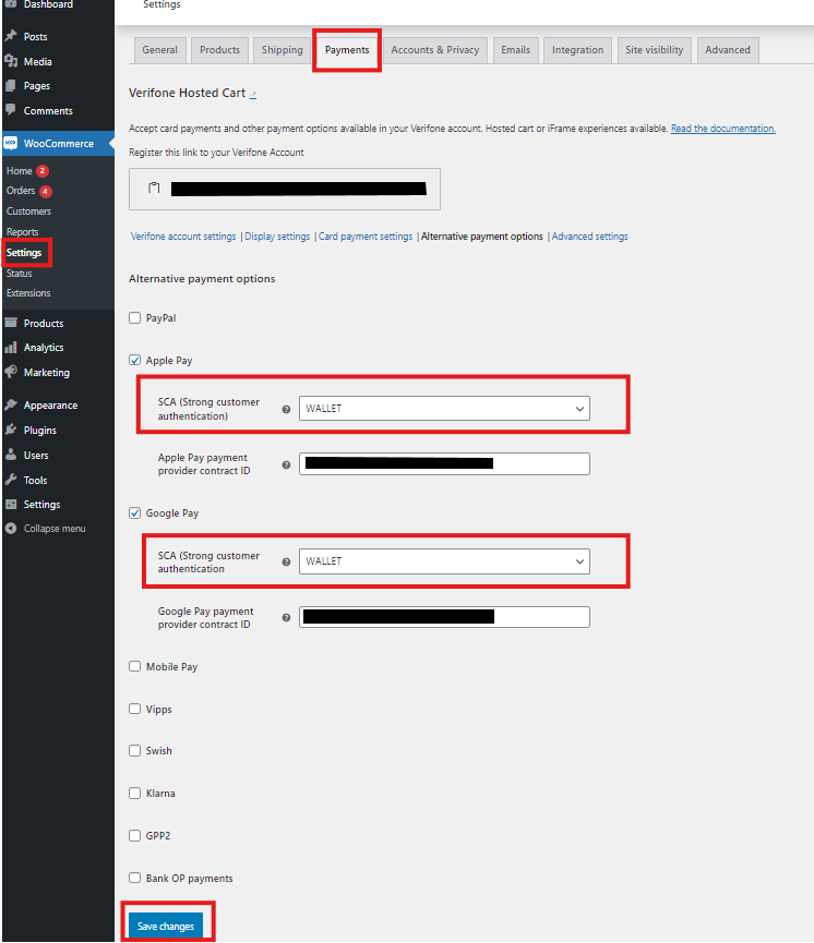 Under Alternative payment options, select the payment methods you want to enable for your WooCommerce store. Currently, you can enable Apple Pay and Google Pay.