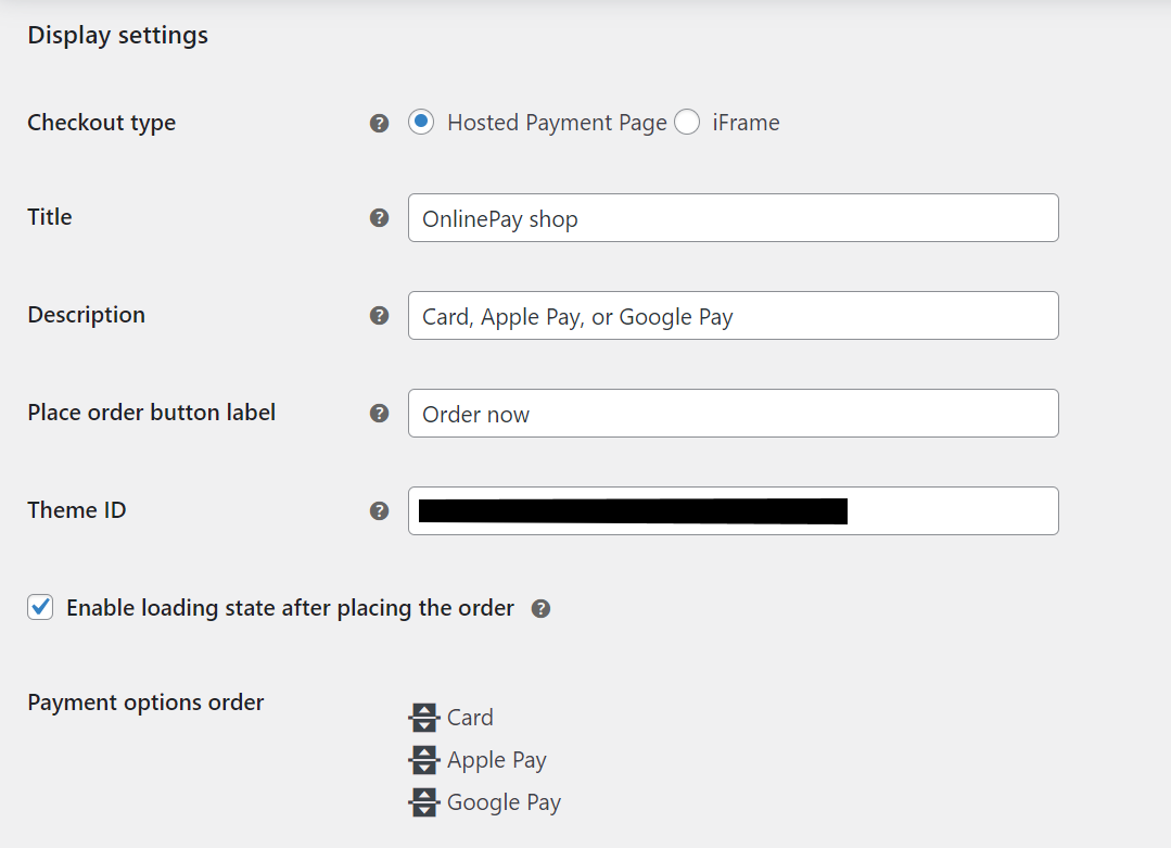 Theme ID: The theme ID to use for the checkout page. This is a custom theme that you have created in the OnlinePay dashboard. See Customise your Checkout for more information.